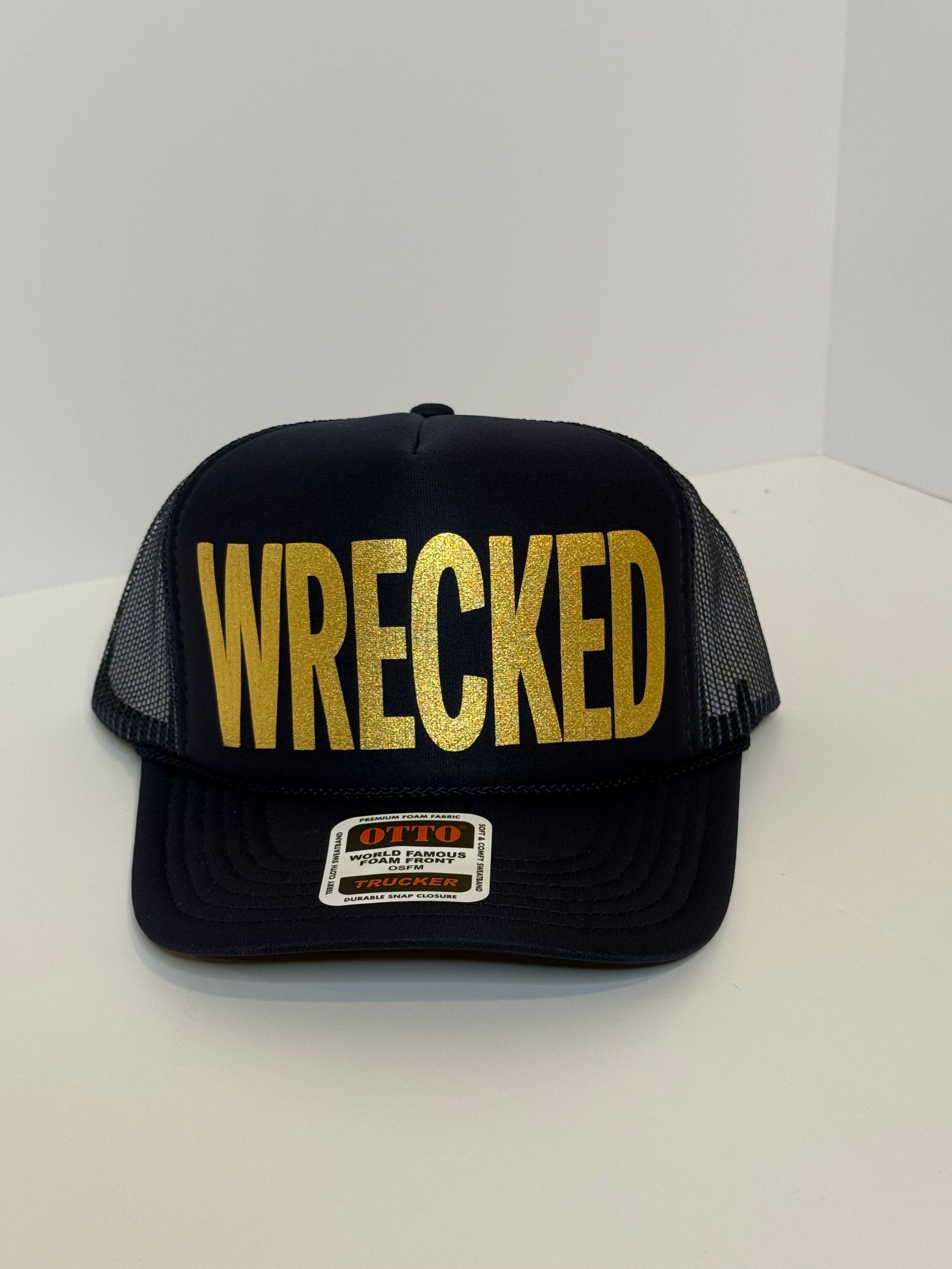 This Otto foam trucker features a navy hat with "WRECKED” in glitter-gold lettering. The ultimate school spirit hat.